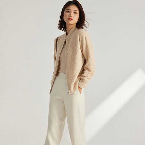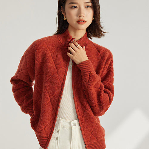 Imagine a sweater that feels as light as air yet keeps you perfectly warm. The Nya - Zip-Up Cashmere Jacket redefines coziness with its luxuriously soft knit and structured diamond pattern. Designed for modern elegance, it features a high ribbed collar and a sleek zip closure that create a sophisticated silhouette while maintaining a relaxed, comfortable fit.
