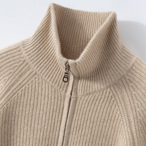 The Lirendria – Ribbed Cashmere Cardigan redefines everyday sophistication through its sleek silhouette and tactile rib-knit texture. The high stand collar adds a contemporary note, while the smooth two-way zipper offers versatility—fully closed for a clean, minimalist profile or left open for effortless layering. Its structured design enhances the natural softness of pure cashmere, making it both refined and inviting.