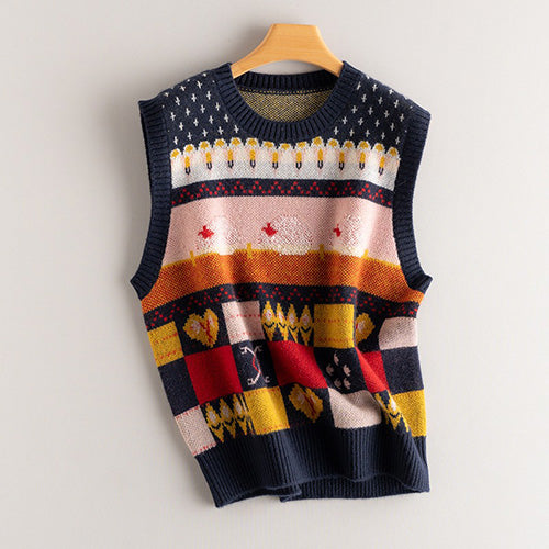 This eye-catching vest showcases a stunning patchwork of colors and patterns, creating a one-of-a-kind artistic statement. Designed with meticulous craftsmanship, the intricate knit patterns demonstrate unparalleled attention to detail and creativity.