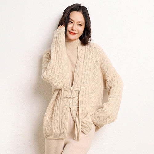 Wrap yourself in effortless sophistication with the Azelis - Cable-Knit Cashmere Cardigan. The intricate cable-knit texture showcases expert craftsmanship, while the front-tie closure adds a touch of softness and femininity. Designed for both structure and drape, it creates a flattering silhouette that is as comfortable as it is refined.