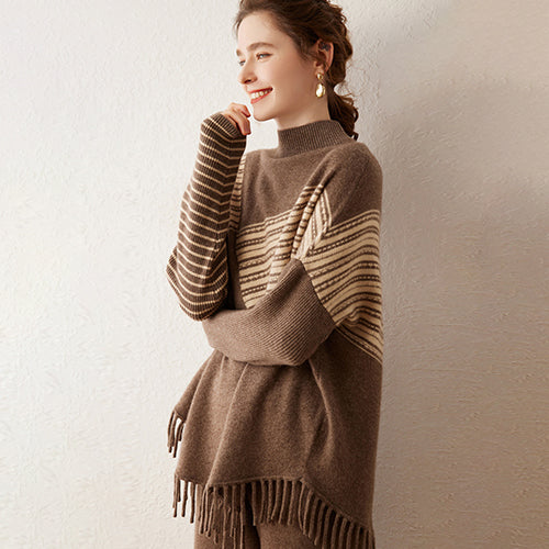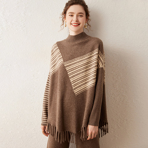 Some designs transcend trends to become instant classics, and the Magda - Poncho Cashmere Sweater is one of them. Combining the ease of a poncho with the structure of a sweater, it offers an effortlessly chic silhouette that’s both refined and relaxed. The geometric pattern adds a touch of modern artistry, while the soft fringe detailing gives movement and texture, making it a standout layering piece.