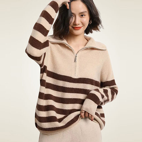 The Zoe Half Zip Cashmere Sweater brings a modern edge to classic knitwear with its bold horizontal stripes. This playful design adds character to a versatile silhouette, making it a standout piece in your wardrobe. The half-zip neckline and wide collar enhance its contemporary feel, offering a customizable look to suit your style.