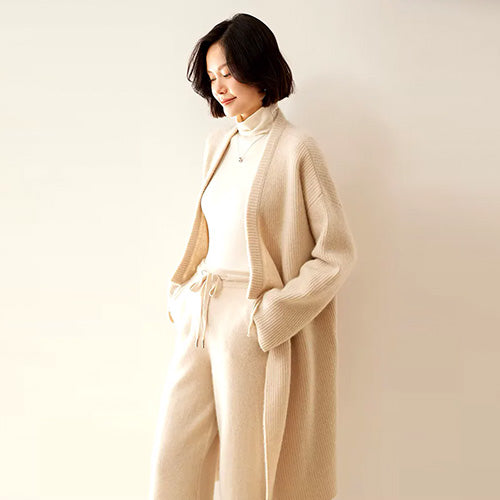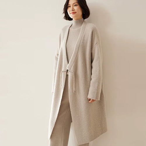 The Julia - Long Cashmere Cardigan is your go-to piece for effortless elegance. Made from high-quality cashmere, it features a graceful wrap-front design with a tie closure, offering a personalized fit that flatters all body types. The soft texture and minimalist design make it an irresistible blend of comfort and sophistication.