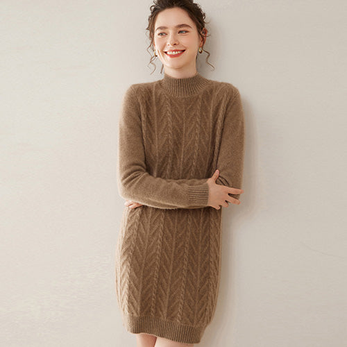Step into effortless elegance with the Sandrine - Cable Knit Cashmere Dress. Designed for those who appreciate the finer things, this dress balances classic charm with modern sophistication. The delicate cable-knit detailing adds texture and depth, while the high mock neckline enhances its cozy appeal.