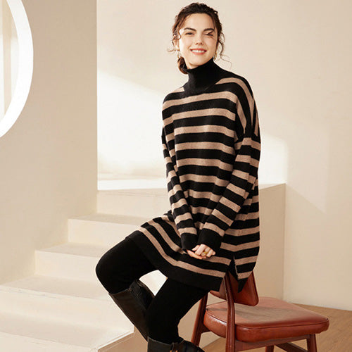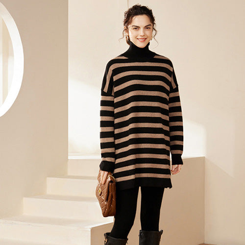The Ovelia - Striped Cashmere Turtleneck Dress invites you to experience both bold style and luxurious comfort. The contemporary striped design blends effortlessly with the sophistication of a high turtleneck, ensuring you stand out in any setting. Whether you’re heading to brunch or a cozy evening in, this dress redefines versatile elegance.