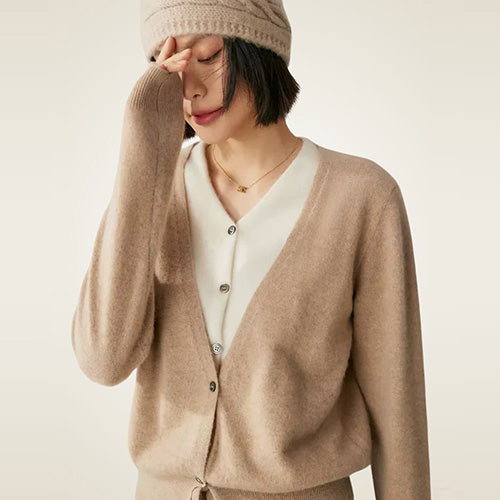 The Riley - Two-Tone Cashmere Cardigan invites you to discover a refined blend of modern elegance and timeless comfort. Its two-tone design brings an understated sophistication to this versatile piece, allowing it to pair seamlessly with your wardrobe. Whether layered over a sleek blouse or worn casually with jeans, its deep V-neckline and classic button-up front ensure a polished yet relaxed look.