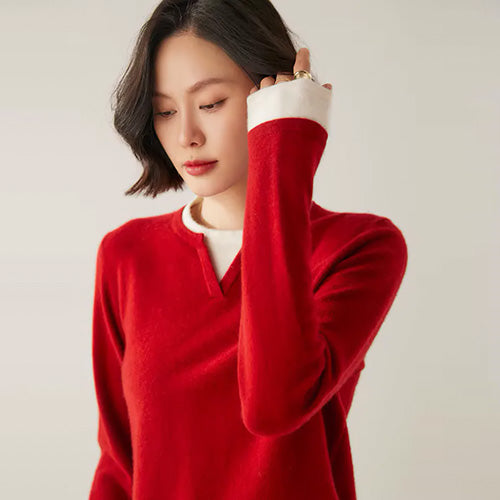 The Amber - Crewneck Cashmere Sweater blends timeless elegance with modern details. The V-stitch accent at the neckline and subtle contrasting trim elevate this classic design. Made from premium cashmere, it offers luxurious softness and lightweight warmth, ideal for any season. Whether layered over a shirt or worn solo, its versatile style adapts effortlessly to both casual and refined settings.