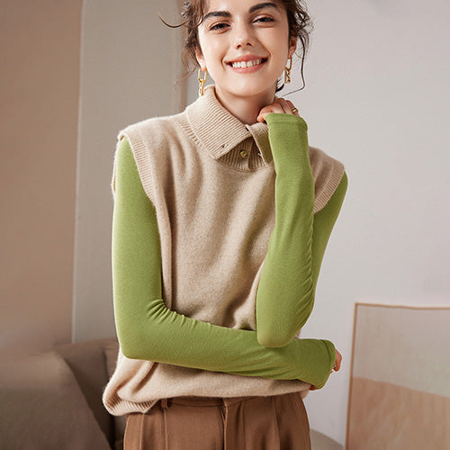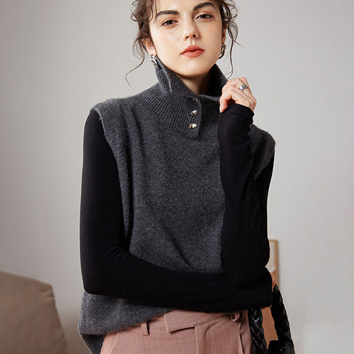 Imagine a wardrobe staple that effortlessly combines elegance and comfort. The Isela - Cashmere Collared Vest redefines layering with its chic high neckline adorned with button accents. Crafted from 100% premium cashmere, this piece offers an exceptional softness that feels like a gentle embrace, making it a luxurious addition to any outfit.