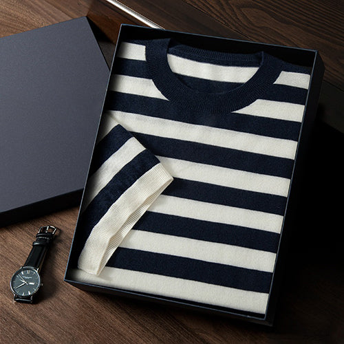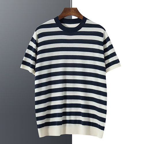 A timeless take on casual luxury, the Cullen - Striped Cashmere T-Shirt blends comfort with effortless style. The soft, breathable knit provides a lightweight feel, while the classic crewneck and relaxed fit make it a versatile wardrobe essential. Perfect for layering or wearing on its own.