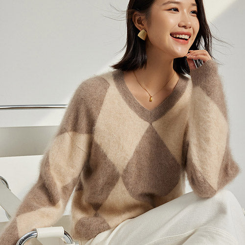 The soft argyle Calyssa - Brushed Cashmere Sweater blends vintage charm with contemporary elegance. The oversized diamond pattern in warm beige and mocha tones creates a subtle statement, while the fluffy texture adds a cozy and luxurious feel. Designed with a relaxed fit and ribbed trims, it offers both comfort and visual appeal.