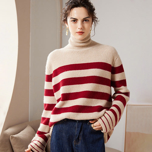 Wrap yourself in the perfect combination of luxury and warmth with the Kyla - Striped Cashmere Turtleneck. Its bold horizontal stripes exude a timeless charm, while the high-quality cashmere offers unmatched softness and lightweight comfort. Whether you’re stepping out for a casual coffee date or staying in on a cozy evening, this turtleneck brings effortless elegance to every moment.