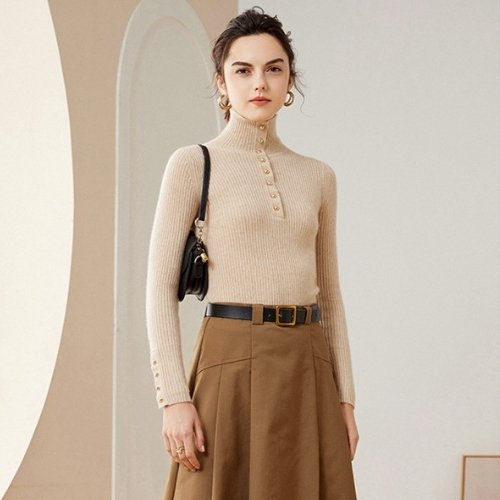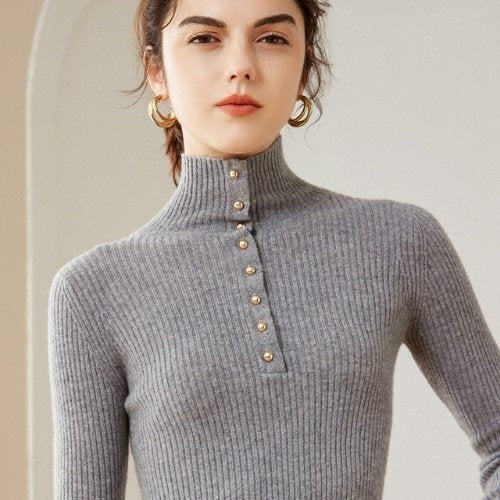 Effortlessly balancing sophistication and comfort, the Jyselle Mock Neck Cashmere Sweater captures the essence of modern femininity. The refined ribbed texture embraces the body with a gentle stretch, creating a sleek silhouette that flatters without constraining. A row of delicate gold-toned buttons along the high neckline adds just the right touch of grace — understated yet captivating.