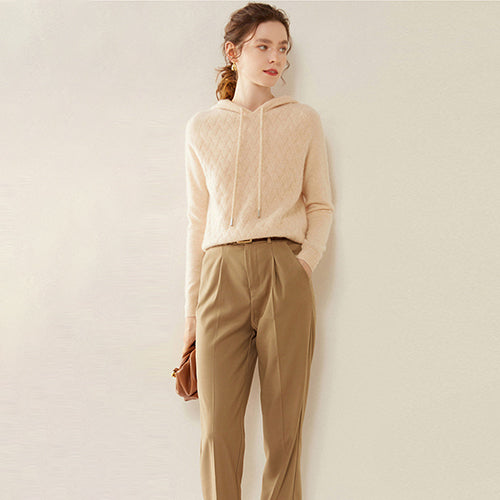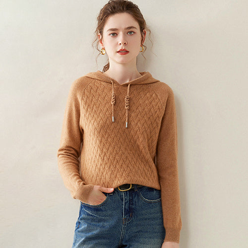 Designed for effortless elegance, the Amelise - Chevron Knitted Cashmere Hoodie features a subtle chevron knit that adds texture and dimension. The relaxed fit drapes beautifully, while the soft knit enhances its luxurious feel. Finished with ribbed cuffs and a drawstring hood, it blends comfort with understated sophistication.