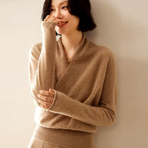 The Clara Wrap Cashmere Sweater elevates everyday comfort with its uniquely elegant design. The wrap front delicately drapes over your silhouette, offering a flattering and refined look for any occasion. Made from the softest cashmere, it delivers an indulgent feel against the skin while providing the warmth you need during chilly seasons. The subtle yet stylish details, including ribbed cuffs and hem, make it a versatile piece for casual days or formal evenings.