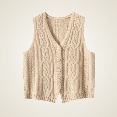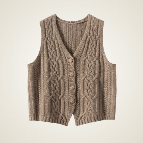There’s something instantly comforting about slipping into a piece that feels both familiar and elevated. The Levara – Cable-Knit Cashmere Vest offers that feeling from the very first touch, wrapping you in a soft, breathable layer of pure cashmere. Its beautifully sculpted cable motifs add depth and dimension, creating a refined look that pairs effortlessly with shirts, turtlenecks, or light knits. With a gentle V-neckline and fully covered buttons, it brings quiet sophistication to any outfit.