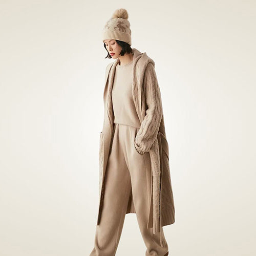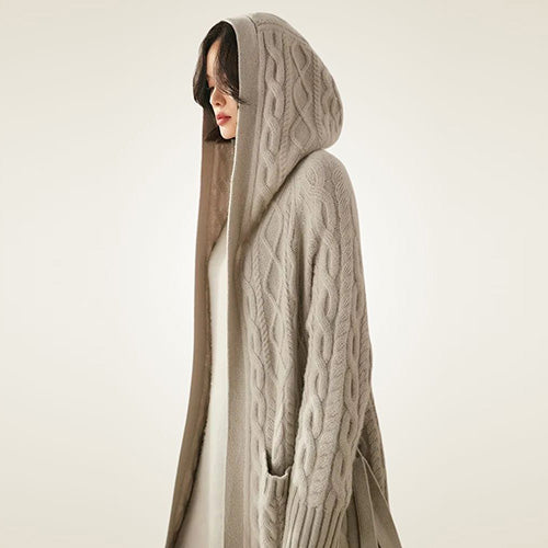 Crafted from the finest cashmere, the Leah Cardigan combines timeless elegance with cozy practicality. Its intricate cable-knit pattern and longline silhouette create a refined look, while the hood and belted waist add both warmth and a flattering fit. This luxurious cardigan is perfect for layering, offering effortless sophistication for any occasion, from lounging at home to elegant evenings out.