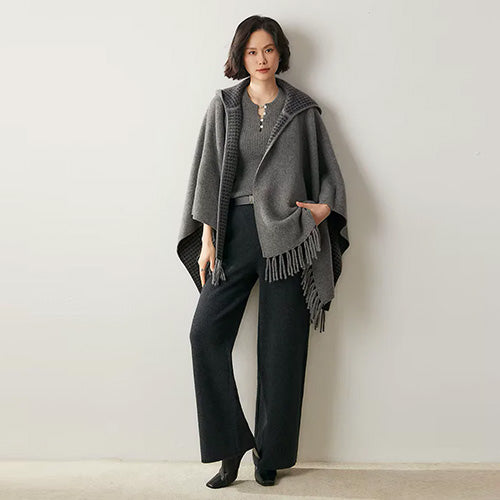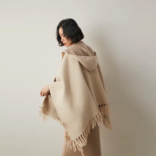 Experience unparalleled comfort with the Nathalie - Reversible Hooded Cashmere Cape, a timeless statement piece that seamlessly blends elegance with versatility. Made from high-quality cashmere, this cape features a reversible design, offering two stunning looks in one. On one side, a subtle woven texture brings classic refinement, while the smooth finish on the reverse side creates a sleek, polished style. The hood adds a relaxed sophistication, making it ideal for both casual outings and elevated ensembles.