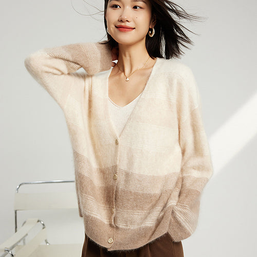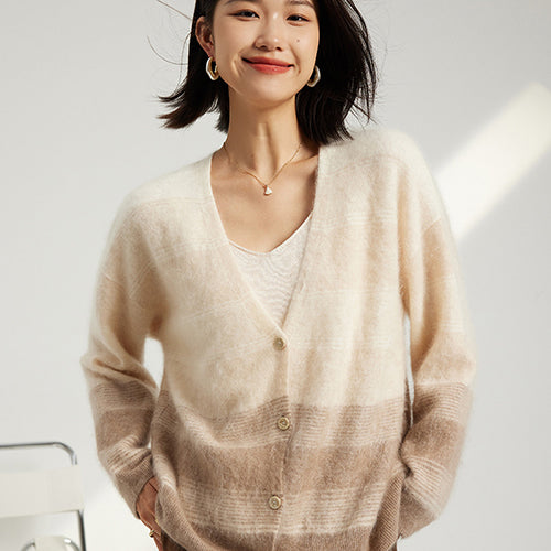 Soft, airy, and effortlessly refined—the Lorelai - Ombre Cashmere Cardigan is designed to drape beautifully over the body, offering a relaxed yet sophisticated silhouette. The delicate ombre gradient blends seamlessly from light to deep tones, evoking a dreamy and ethereal aesthetic that enhances any wardrobe.