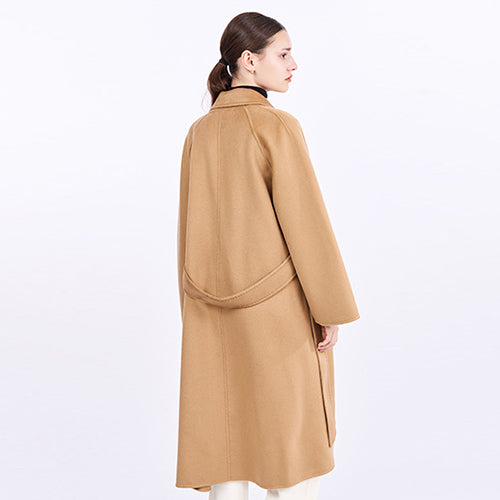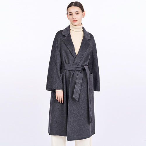 The Sofia - Long Cashmere Coat delivers a refined take on timeless outerwear. With a relaxed yet structured fit, this coat is designed to drape elegantly while offering warmth and sophistication. The belted waist allows for a customizable silhouette, cinching effortlessly for a flattering fit. Its fluid lines and knee-length cut make it an essential layering piece that transitions seamlessly between casual and formal settings.