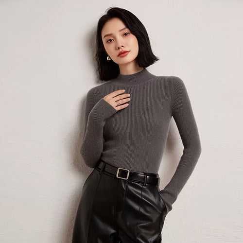 The Lily - Mock Neck Cashmere Sweater embodies timeless sophistication with its sleek design and refined high neckline. Its ribbed texture adds a modern touch to the classic silhouette, creating depth and dimension. Perfect for both casual and formal occasions, this sweater seamlessly blends comfort with effortless style.