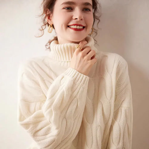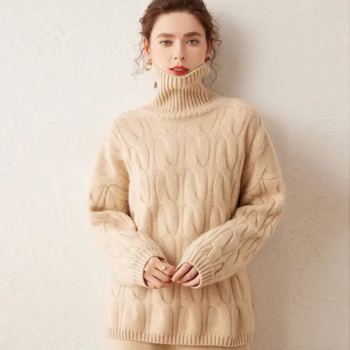 The Jordana - Textured Cashmere Turtleneck redefines elegance with its intricate cable-knit design and luxurious high-neck collar. Perfectly crafted, it offers unparalleled durability and a plush feel against the skin.